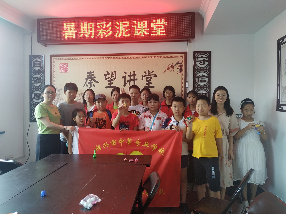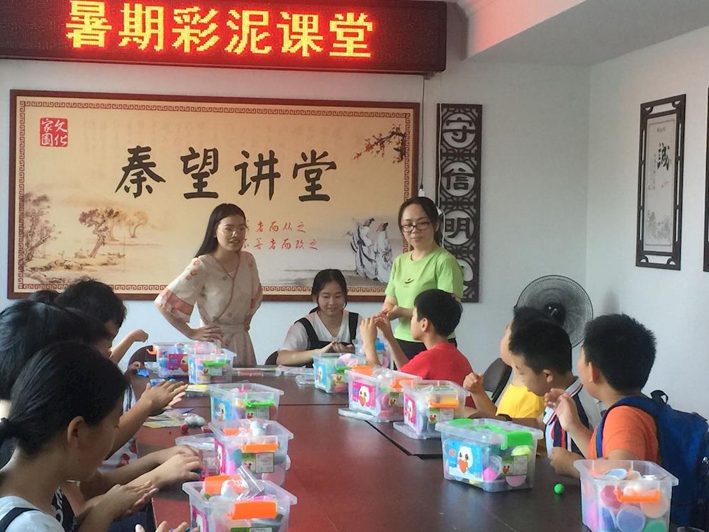 8月15日上午,绍兴中专的志愿者学生们在朱红、孙丹荔老师的带领下,前往秦望社区送教,教授小朋友们如何用彩泥进行艺术创作。
