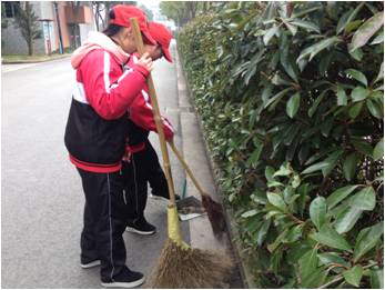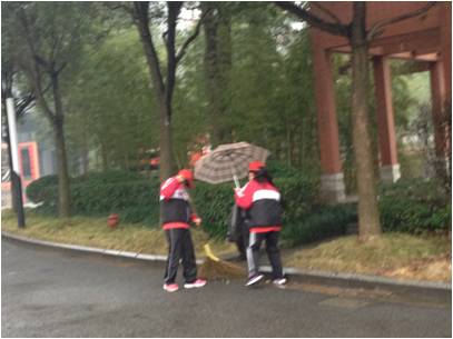 劳动服务周的第一天天空就下起了雨,但是阻挡不住同学们的热情,他们甚至不带伞的进行工作、劳动。之后的几天天气晴朗,阳光下,那红色的帽子是那么的耀眼。同学们积极主动,见到果皮、纸巾、纸屑、树叶都能用负责的态度处理。见到老师还主动问好,笑容得体。