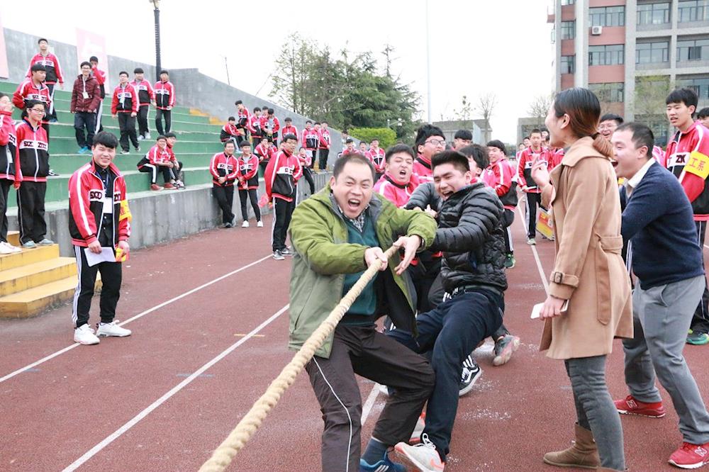 在班主任的带领下,清一色的男生队伍展现在我们面前,摩拳擦掌,跃跃欲试。随着比赛的哨声响起,一场力量之间较量就此展开。各班选手们按照原先商量好的作战技巧,双手紧握麻绳,以蹲坐之势身体微向后倾使重心后移,双方都用尽全力拉扯。他们不顾手掌与麻绳间摩擦的疼痛,一个个涨红了脸,用尽全身力量来赢得比赛。在外援老师的帮助下,赛情变得更加激烈,使场面常常陷入僵持状态,一时间难以分出胜负。最后在意志的较量下终于有了胜负结果。