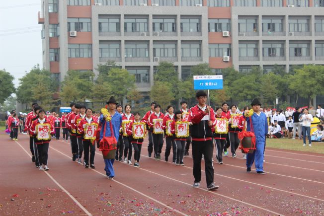 生物化工系教师团队作为第一个入场的方阵,他们斗志昂扬、精神饱满、面带微笑,迎面向主席台走来,充分展现了其团结互爱的化工精神。这次开幕式,各班级也是集思广益,创新出奇。有14染整技术班穿小黄人招手卖萌的;有放飞白鸽、放飞希望的;也有13分析5年大胆尝试,一男生跨性别,男扮女装,袭一身白婚纱,长发飘飘,翩翩而来,引得周围学生阵阵喝彩;最有特色的要属13黄酒酿造班了,远处两位同学身穿蓝色衣服,头戴乌毡帽,挑着两缸黄酒,嘿呦嘿呦地稳步走来;19张刻着不同“酒”字抒写方式的举牌,承载的有他们对所学专业的热爱;也有对未来大学之梦的期待。班主 任潘丽莉 老师讲解说:“运动会的开幕式,在体现学生健康阳光的同时,也要结合他们所学专业,体现其专业特色。”
