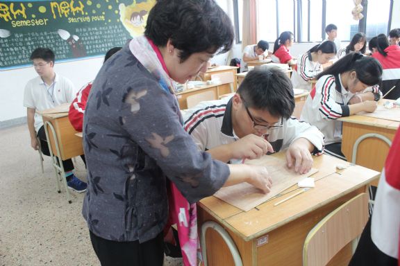 “我们班上的学生喜欢艺术,喜欢制作,”班主 任潘丽莉 老师介绍说,“每个艺术品的背后,凝结地是他们的汗水与努力。”是的,“台上一分钟,台下十年功”。当徘徊在教室里时,你会不自觉地被他们专注于笔下图案的那份执着而感动,又为他们创造出美的作品而欣喜不已。看!李婷婷同学正在印花样,只见她全神贯注,一丝不苟,小心翼翼地把模具印在瓶颈上,认真,如她;也有 潘丽莉 老师手把手教授潘银邦同学如何在画板上均匀地涂上沥粉,负责,如她;还有一群学生围在一起,讨论磨平酒瓶的技巧以及涂色的注意点,勤奋刻苦,如他们。