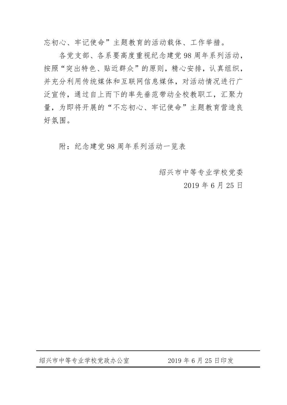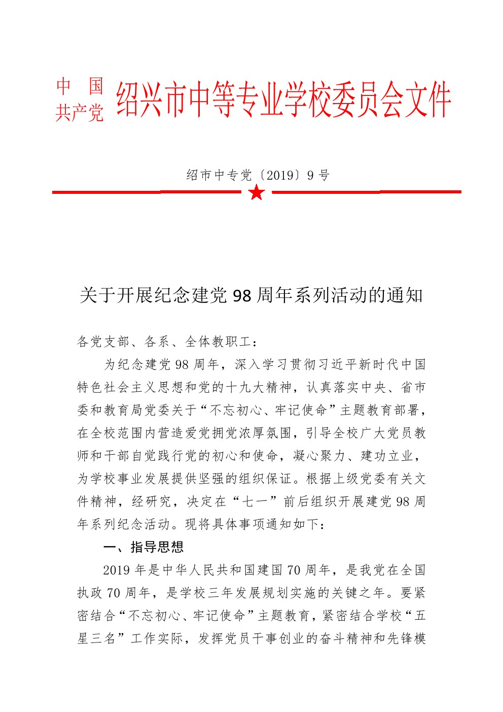 绍市中专党[2019] 9号-关于开展纪念建党98周年系列活动的通知