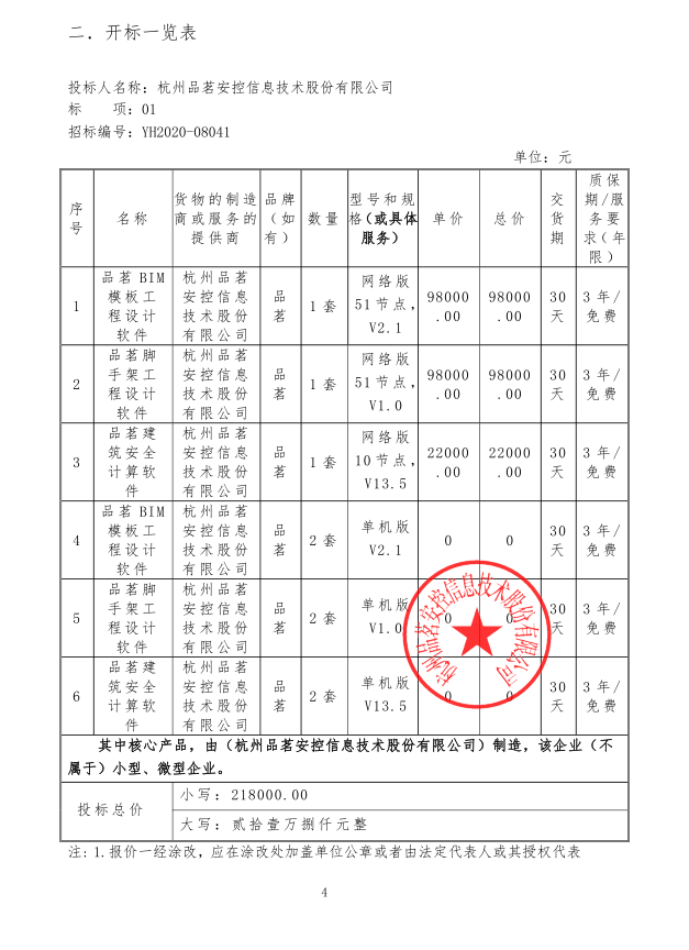 1 | 218000元 | 杭州品茗安控信息技术股份有限公司 | 西斗门路3号天堂软件园B幢5楼C座 |