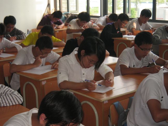 (上图分别是颜璐萍、董炜和阮晓丰三位老师正在和学生一起参加《学生手册》考试。)