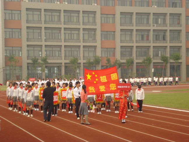 2009年10月14日下午13时30分,丹桂飘香,秋高气爽,细淡的阳光透感过云层笼罩着新建的运动场,给运动会染上了一层诗意的色彩。此时,五大学区的方阵表演准备活动也早已热火朝天地开展起来。“齐心协力开好运动会,昂首阔别建设新校园”。“锻炼身体,增强体质,服务社会”等由我校为运动会专门制作的标语在场外随处可见。场内,“同一个世界,同一个梦想”八个大字标牌更彰显了外语学区的卓而不群的气势。