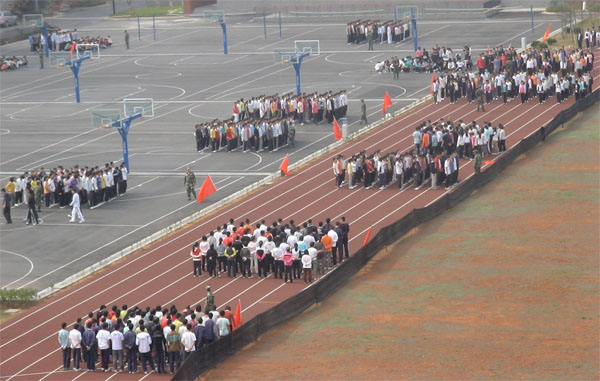 军训第一天 来源:信息中心 作者: 发布时间:2015-11-25 浏览次数: 次 【字体:小 大】 5月5日,是绍兴中专09届预科新生军训第一天,中专球场上,操场上荡漾着新生们铿锵有力的口号声,展示着刻苦坚强的英姿。 一大早,娄校长、卢书记、冯校长、王校长,都早早的在教学楼、操场上、广场上、球场上巡视了,随着集中的“号角”,各预科班学区长、班主任、教官们带领着各自的队伍,开始了为期一周的军训历程。