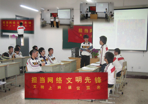 4月8日,08数控2班召开了“网络——让我欢喜让我忧”主题班会,就这些问题展开了深入的讨论。同学们通过相声、辩论、讨论、歌曲、倡议签名等等节目形式,向在场的同学们剖析了上网的利与弊,该怎样做才能“取其精华,去其糟粕”,让网络成为我们认识世界的窗口。