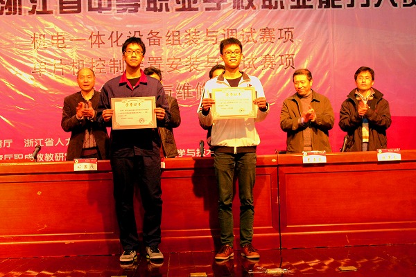 冯建强、朱锦杰同学(左一、二)荣获浙江省中职学校职业能力大赛电气安装与维修赛项团体一等奖(指导老师:施建明、薛振华)