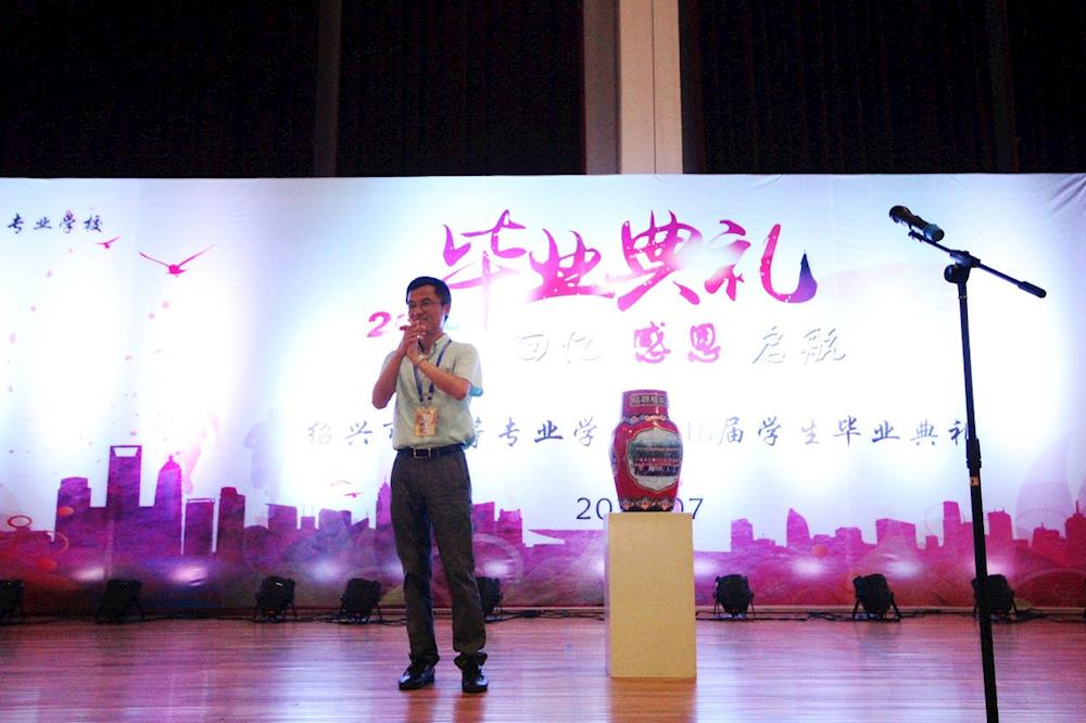 紧接着,在《2016届班主任寄语》的短片中,毕业生代表献上了留赠母校的纪念品——由13黄酒酿造班亲手制作的花雕酒坛。此刻,最贵重的礼物也代替不了学子们对母校的那些纯真的笑与泪,这些最真挚的情感终将被学校永久地珍藏。