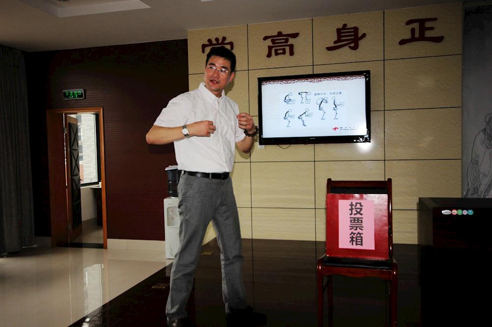 讲座的上半场由沈灏医师主讲。脊柱病是现代社会,尤其是办公室伏案工作人员的常见疾病,沈医师以“养成良好的生活习惯,保护我们的脊柱健康”为题,从脊柱病的异常表现和发病趋势的介绍出发,重点阐述了脊柱病的病因和生理特性;他从纠正工作中的不良姿势和不良生活习惯入手,指出了正确的姿势和习惯。他还为教职工们亲身示范了预防脊柱病的锻炼方法,沈医师的生动阐述和简单实用的锻炼方法一下子抓住了教职工们的注意力,让大家受益匪浅。