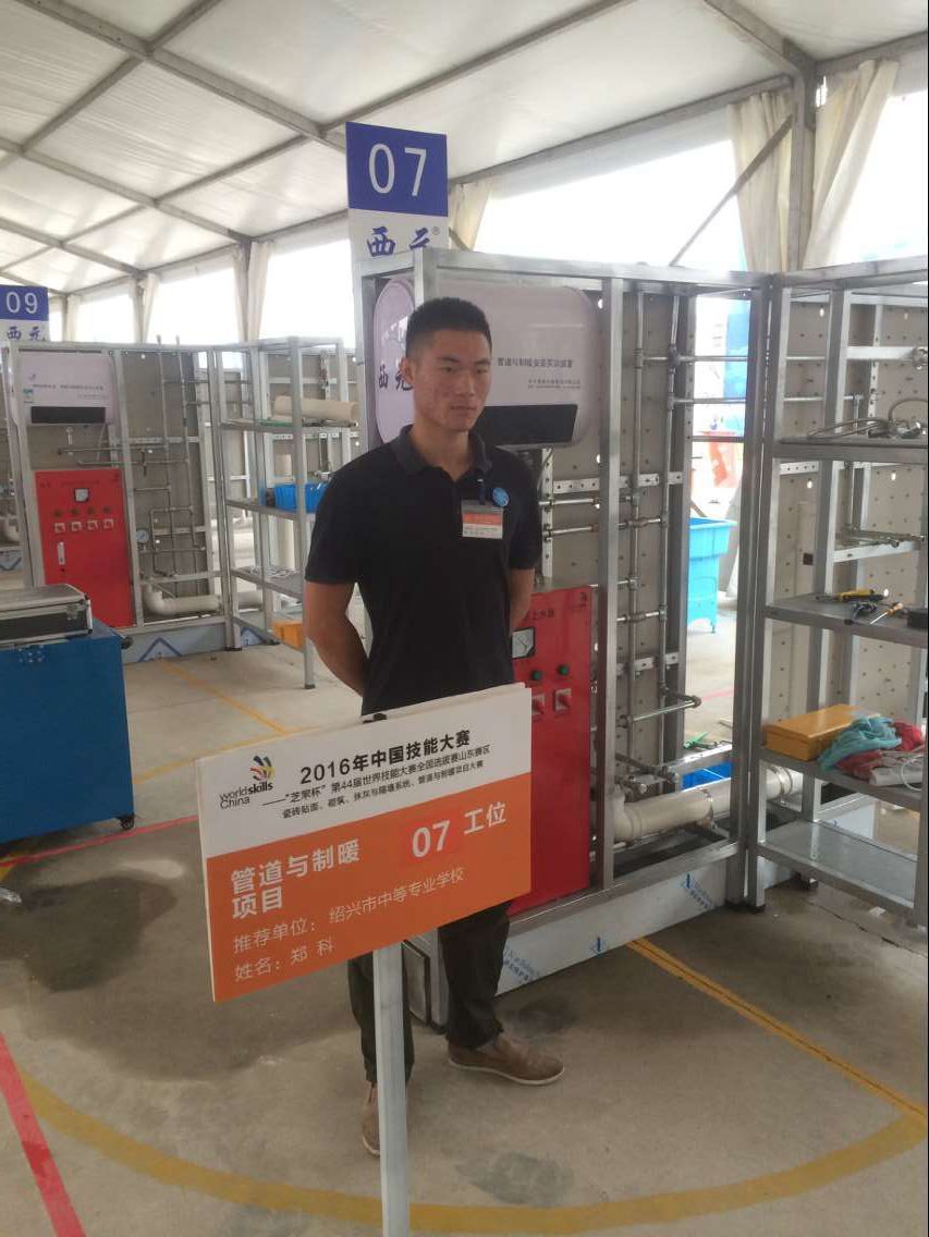 由人力资源和社会保障部举办的第44届世界技能大赛全国选拔赛是2016年中国技能大赛的一项重要赛事,全国有近千名选手参加,竞赛规模、参赛人数和竞技水平都创造了历史之最,其中山东赛区的比赛在山东省烟台市城乡建设学校开赛。据悉,本次比赛参照世界技能大赛的特点、规范和标准,对选手的要求非常严格,在长达6个小时的比赛中,代表浙江队出战的郑科以高昂的斗志沉着应战,在克服了比赛设备与训练设备有差别,材料在搬运过程中精度上产生了误差等诸多不利因素后,高质量、高精度地完成了PVC排水管工程安装、PPR管基本安装、锌钢管工程安装三个比赛模块,从来自全国8支队伍的20名好手中脱颖而出,以第一名的身份强势入围了由该项目全国十强组成的国家集训队。在为期一年的集训和选拔后,他将有机会代表中国参加2017年10月在阿联酋阿布扎比举行的第44届世界技能大赛。
