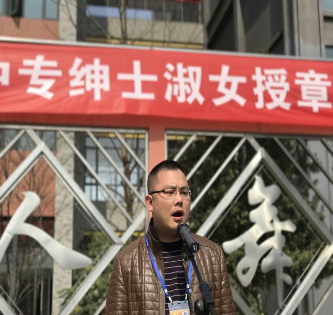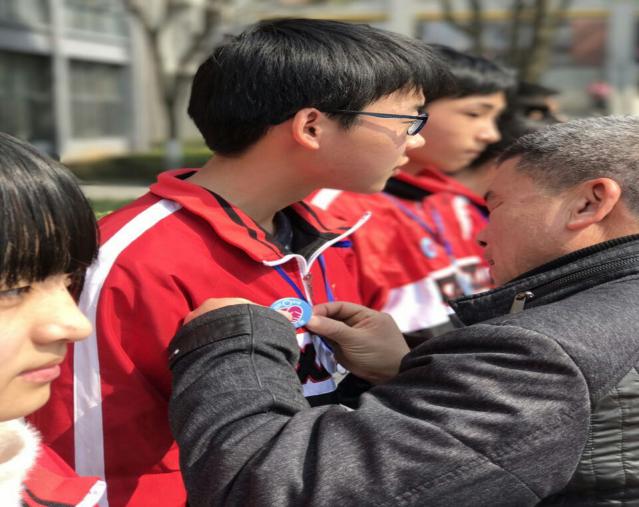 学生处长屠小夫老师为获奖者佩戴徽章 团委书记兼学生处副处长沈蕾老师讲话