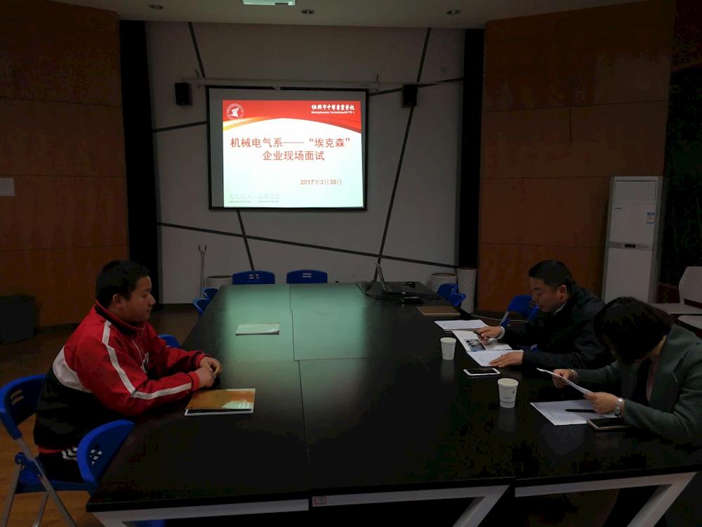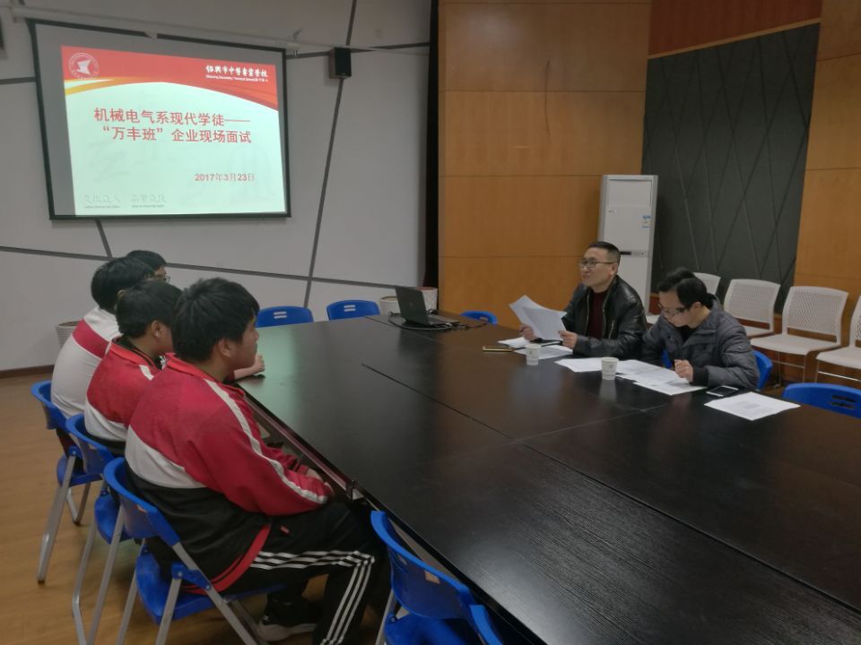 万丰企业2名高管对我校“万丰班”的学生进行了面试,全班全部录取。埃克森电梯维保部的王总和罗主任前来面试,15电气运行班11人、15城市轨道班12参加了这次面试,王总对面试学生提出了踏踏实实,勤勤恳恳努力学好技术的要求,同时也将公司一直宣传的“快乐工作”的企业文化讲给同学们听,鼓励同学们在学校要好好学习,工作后要快乐工作。经过了此次面试,最终有7名学生被企业录取。