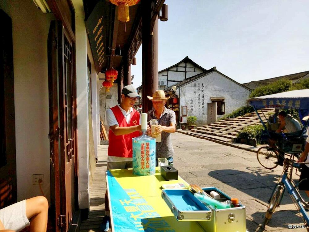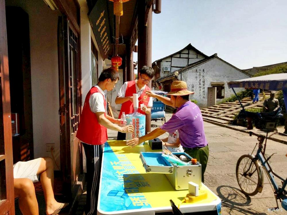 清晨,同学们早早地到达集合地点,做好准备工作。9点钟,凉茶铺正式开张。一张桌子,一桶饮用水,一只简易饮水机,一些纸杯,一盒纸巾,一叠宣传“五水共治”和垃圾分类的倡议书,一块告示牌,四只不同颜色的垃圾桶。仅仅只过了半个小时,就有不少的三轮车师傅拉着游客路过,因为在售票站旁边,不少拉客老师傅就会趁着游客售票的时间来这个服务站歇歇脚,志愿者们也会热心的帮他们加水或是递上纸巾。两个小时的志愿服务,大家挺着一股子劲,热情的去服务路过歇脚的。当上午的任务结束时,同学们收拾完茶摊,留下饮水机和半桶饮用水继续为歇脚的过路人提供服务,志愿者前往路边的小餐馆解决午饭。