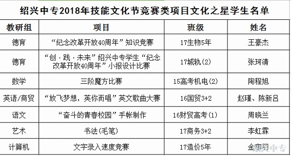 近日,绍兴中专举办了2018技能文化节颁奖仪式,表彰了从这次技能文化节中脱颖而出的技能和文化项目的佼佼者。