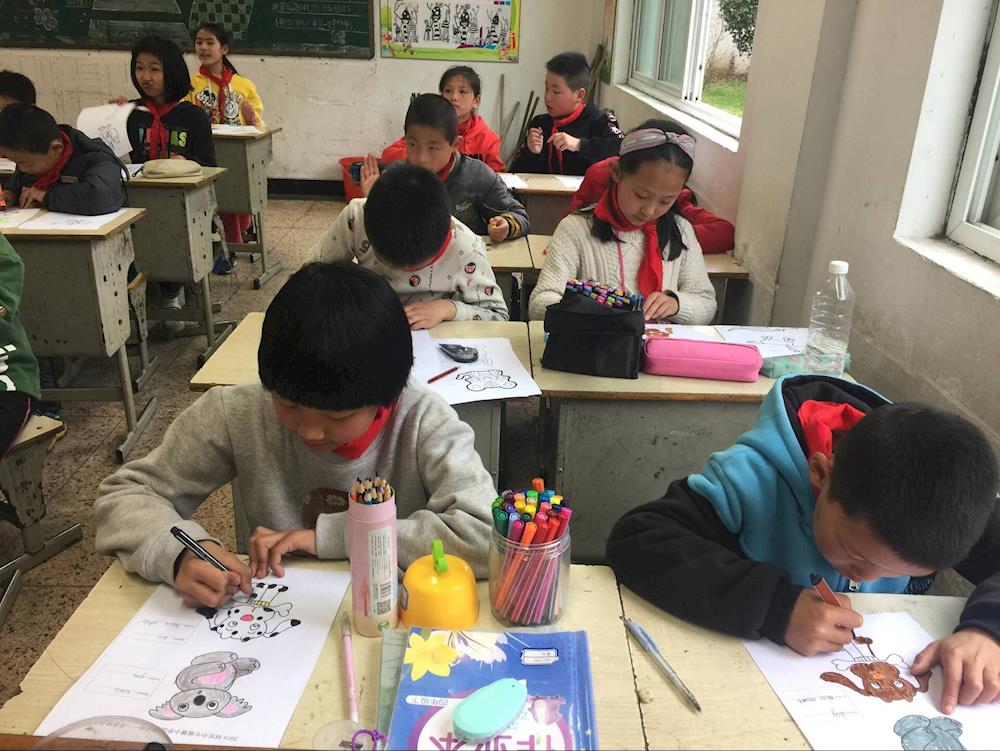 财贸系的两位老师及4名志愿者,在班主任的引领下为四年级1班的的同学带来丰富多彩的英语绘画的送教活动。上课期间,王老师和张老师分别介绍了考拉、袋鼠、鳄鱼、兔子等动物的英文单词以及这些动物是什么颜色的英文单词。随后,让同学们在学习完单词后,根据动物的颜色对画纸上的动物进行上色。上课期间,志愿者们积极指导同学们上色和配色,极大激发了同学们的上课热情。课间休息时间,志愿者们与孩子们玩在一起,有说有笑,建立了良好的情谊。这次寓教于乐的送教活动受到了坡塘小学同学们的一致好评,孩子们不仅学会了英语单词,还通过上色加深对动物的印象。此外,志愿者们认真负责的态度也得到了坡塘小学学校老师的一致好评。